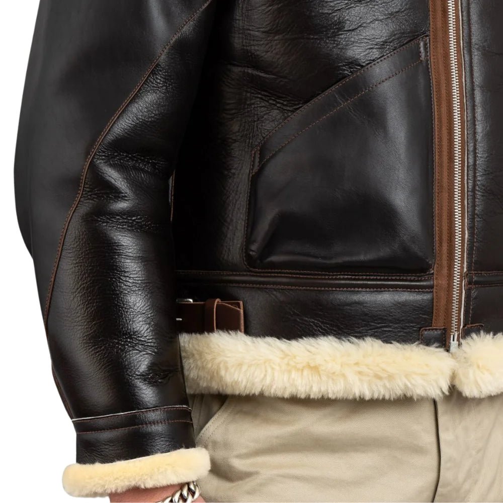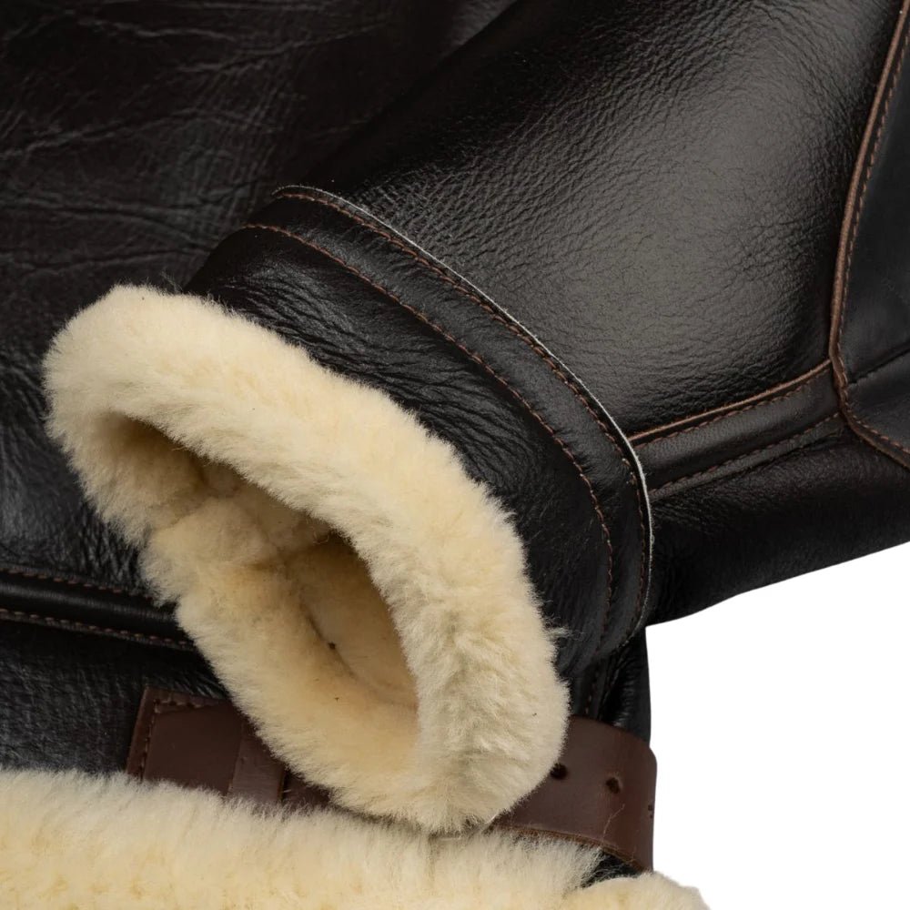 Inside, the jacket features a thick shearling lining that provides excellent insulation. This soft interior helps retain body heat while keeping the wearer comfortable throughout the day. The heavy-duty front zipper is reinforced with a wind flap to block cold air and harsh winds. This design makes the jacket reliable in challenging winter conditions. The shearling-lined sheep leather collar enhances warmth and completes the iconic flight jacket style.