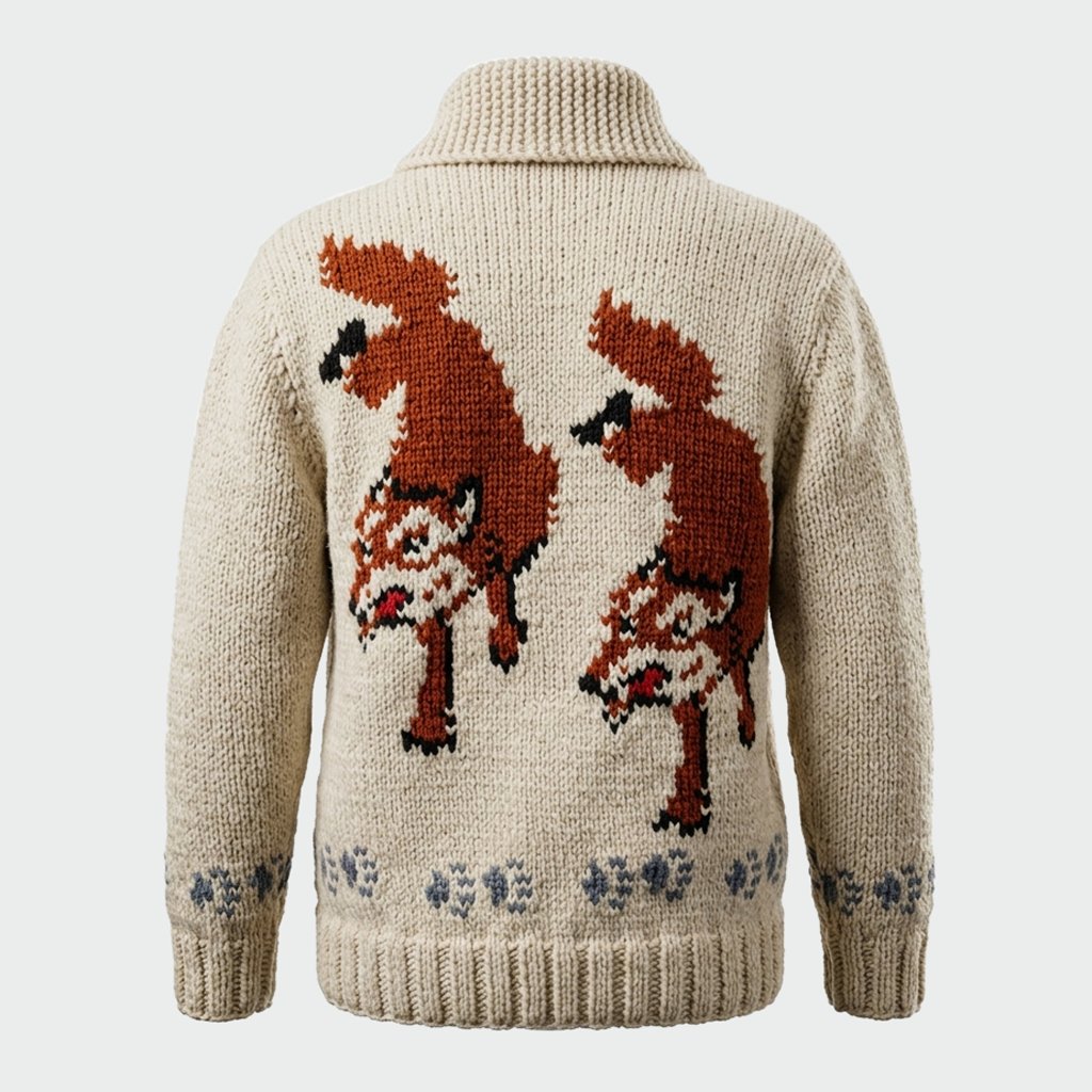 Project Hail Mary Ryan Gosling Wolf Cardigan. This is serious knitwear. It isn’t just a cardigan. It feels like a shield against the cold. The weight is the first thing you notice. It is heavy. It feels like authentic heritage gear. Look at the pattern wrapping around the torso. It features these stylized wolf figures. The earth tones are fantastic. You have that creamy oatmeal base mixed with rust and dark brown. The shawl collar is thick. It piles up around your neck. The zipper is a smart addition. It gives it a bit of a modern edge. The cuffs are tight. They lock in the warmth. It is a piece you keep forever.