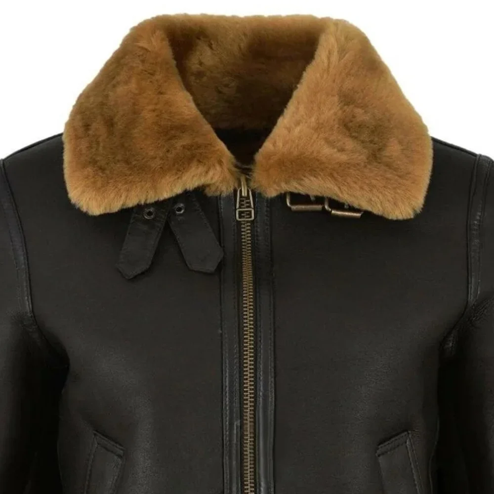The Women’s Black Aviator B3 Bomber Leather Jacket is a classic and stylish outerwear piece designed for women who love vintage aviator fashion with a modern touch. Inspired by traditional B3 bomber jackets worn by pilots, this jacket combines iconic design with contemporary elegance. Made from premium genuine leather, it offers durability, a soft feel, and long-lasting comfort. The thick shearling lining ensures exceptional warmth, making it perfect for colder weather. The tailored fit flatters the female form while allowing freedom of movement. A broad shearling collar and front zip closure with a wind flap enhance both style and protection from the cold. Buckle straps at the collar and waist provide an adjustable fit, combining practicality with classic aviator aesthetics.