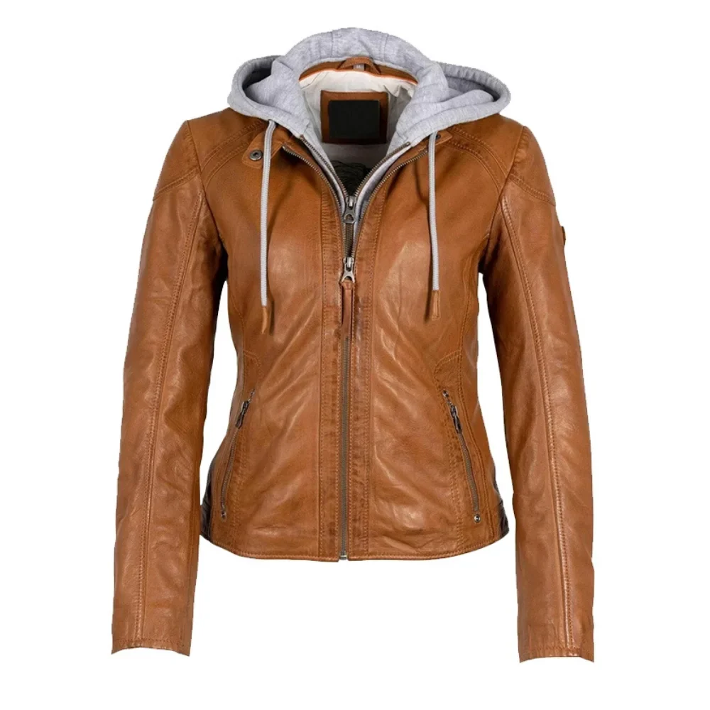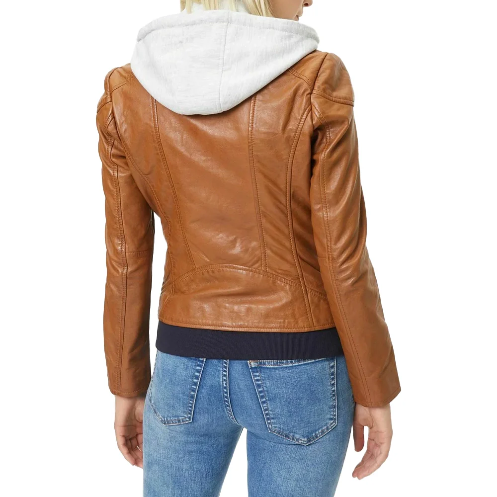 The Women’s Cognac Brown Leather Motorcycle Jacket with Removable Hood features a versatile, fashionable, and functional design suited to the needs of bikers and fashion lovers alike. The brown cognac color chosen for the jacket gives an added warm and stylish effect to the product, making it one of the best choices to wear. Made from high-quality real leather, the jacket provides durability, a smooth finish, and long wear. The soft inner lining not only provides comfort but also ensures warmth, which is ideal for cooler weather but breathable for everyday wear. The fitting design of the jacket complements the female body without inhibiting the ability to move about. The removable hoodie is one of the best qualities that this leather jacket has.